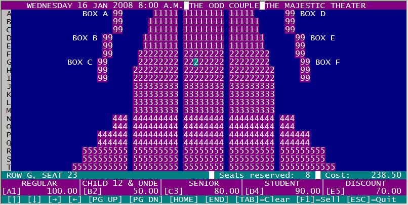 Once you have reserved all the seats the customer wants, he will pay for them and you will press [F1] to print the tickets and receipt. The red backgrounds on the reserved seats will change to black.